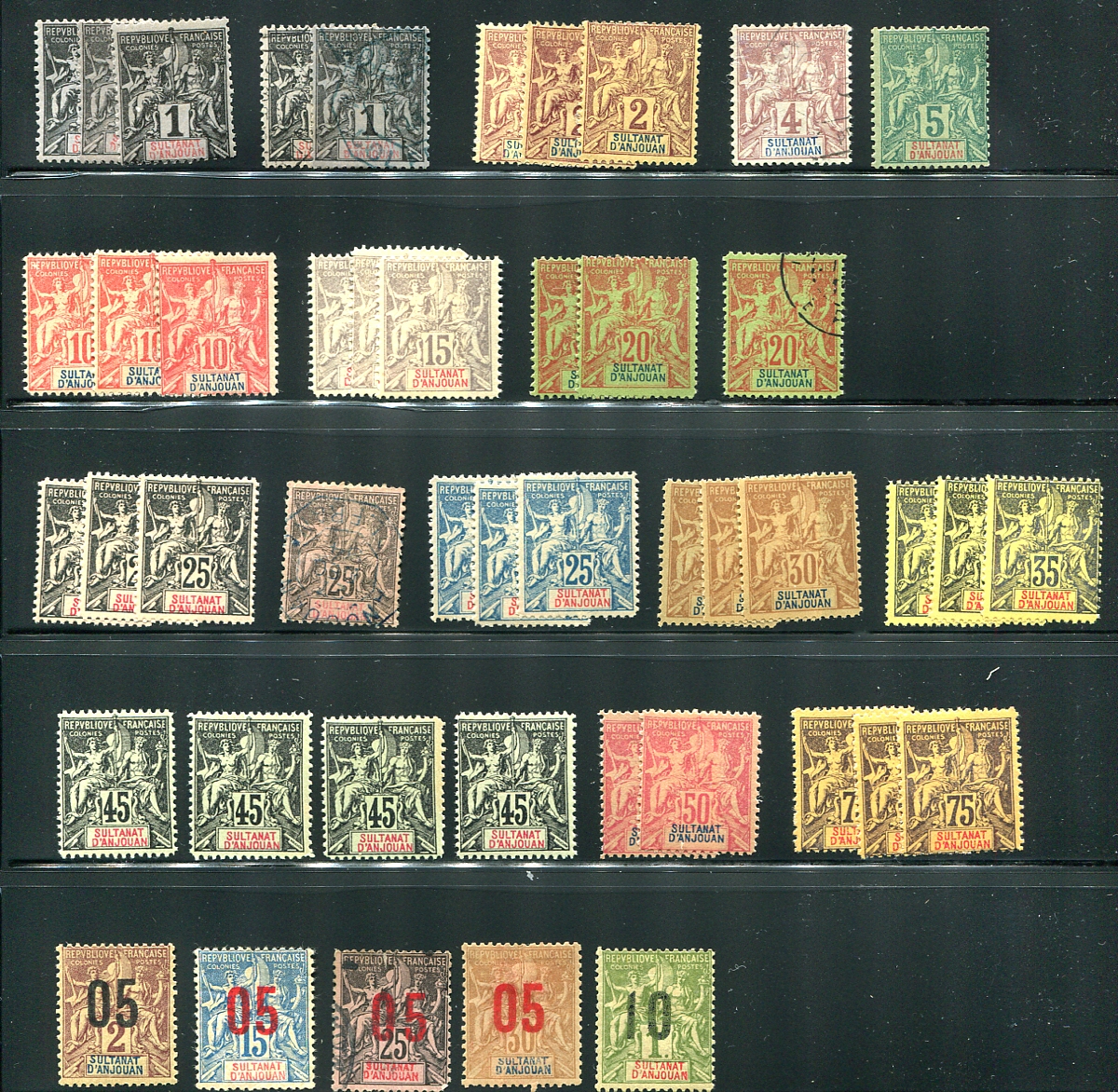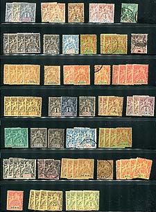 Anjouan #1/18. A page with a small wholesale group from the "Navigation and Commerce", mostly mint and with quantities of up to 4 of a kind. Includes the key 45c value (4 mint copies), plus #6, #8, #11, #12, #16, with 2 or 3 copies of each. That being said, this issue if fraught with forgeries, which are present in this lot. A good "research" group. Estimate =