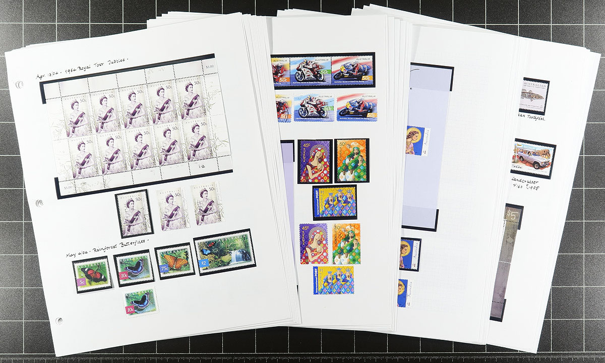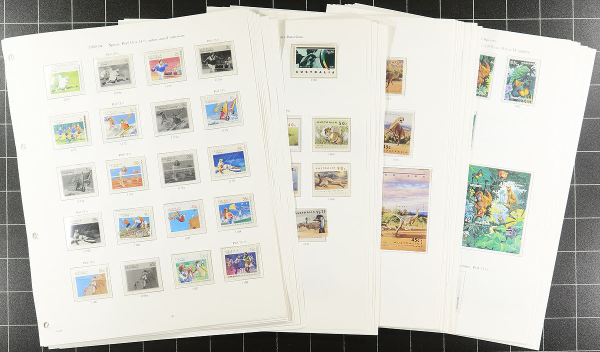 Australia #1106/1474. Comprehensive mint Never Hinged collection of mostly 1991-1995 period issues on hingeless Stanley Gibbons pages in burgundy album. Includes almost all the better die cut self-adhesives, overprinted souvenir sheets, se-tenant strips and blocks. Worth full face at least. Catalogue value will be quite high. Face value AUD $247.91 =