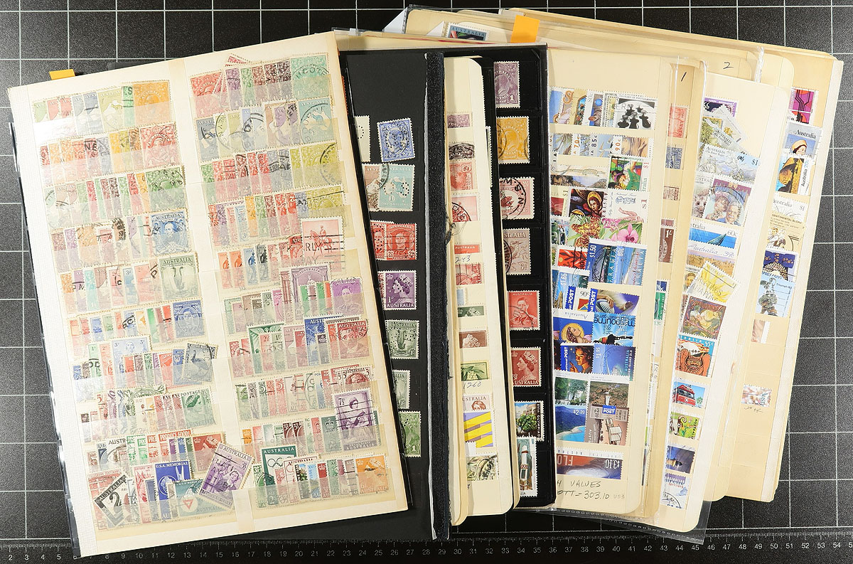Australia - Accumulation of used Australia, 1913-2011, containing a few thousand stamps in roughly 33 stock pages. A quick check of material indicated a bit of everything including selections of Kangaroos, King George V Heads, sets, back of the book material noting postage dues, officials, airmails, and perfins. We spotted a few items cataloguing in the $10 range and up, leaving better finds to the dedicated collector. Owner's 2012 Scott catalogue value for the lot totals US$2,374.00, with duplication up to 10 for some issues. Ideal for the Australia or worldwide collector, with online photos showing a few sample pages. Estimate =