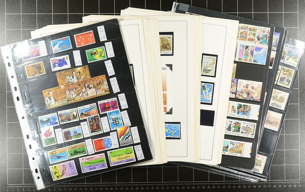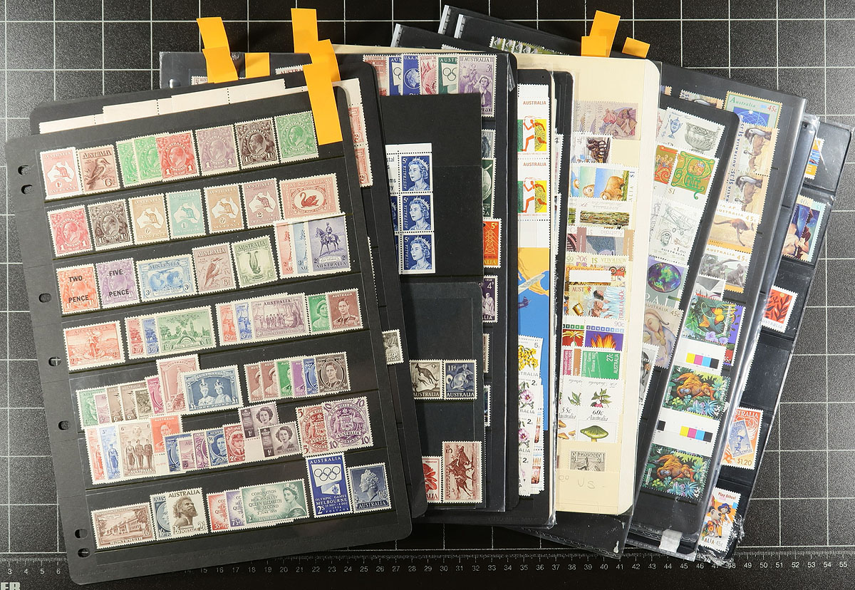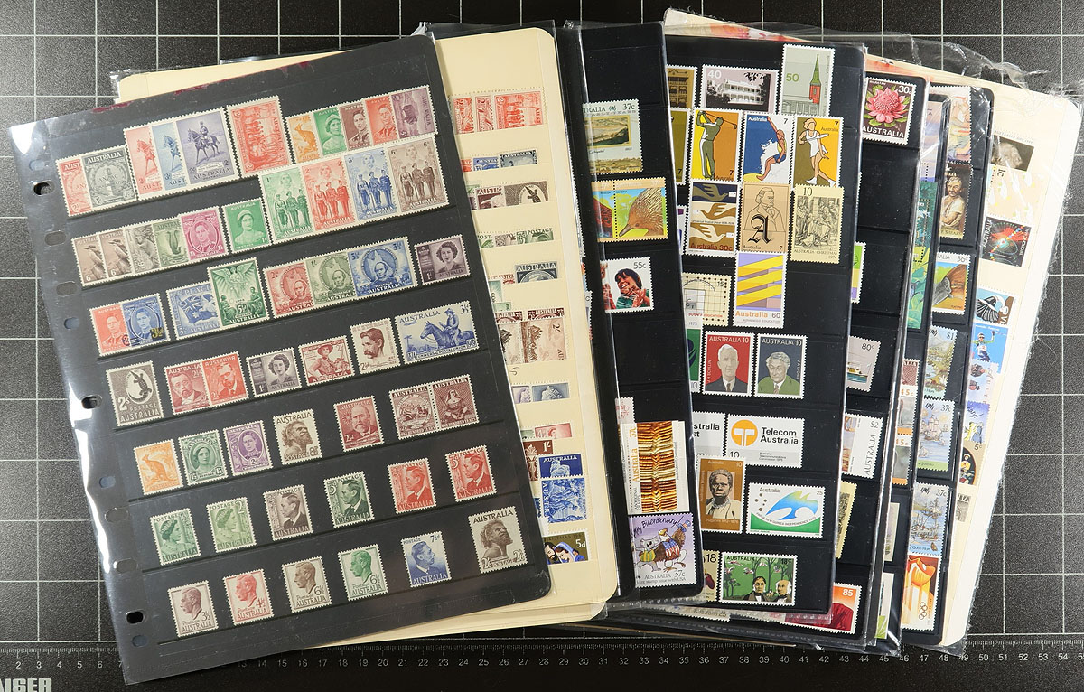 Australia - Collection / accumulation of mint Australia, 1920's-1990's, containing roughly 1,300 stamps in roughly 19 stock pages. The collection generally ranged from Scott #147/1488, including many sets, and a few souvenir sheets and booklets. A cursory check of catalogue values indicated some singles and sets cataloguing $10 and up. Owner's 2017 catalogue value for the lot totals US$1,695.00. The lot is a mixture of hinged and never hinged material (mostly post-1970s), with duplication up to 5 for some issues. Face value alone would be several hundred dollars. Estimate =