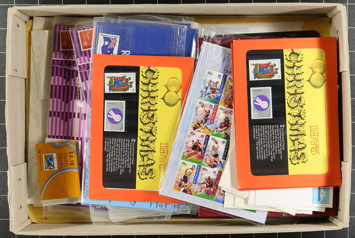 Australia - Lovely group of primarily mint Australia booklets and panes, 1956-2001, in a box. The group consists of roughly 70 booklets and 15 panes (including a few used), noting some booklets and panes cataloguing in the $10 to $30 range each, including Scott #s 318a (x2, $58 total), 397a ($35), just to name a few. Face value alone totals $151.00. A very nice lot for the Australia or booklet collector. Estimate =