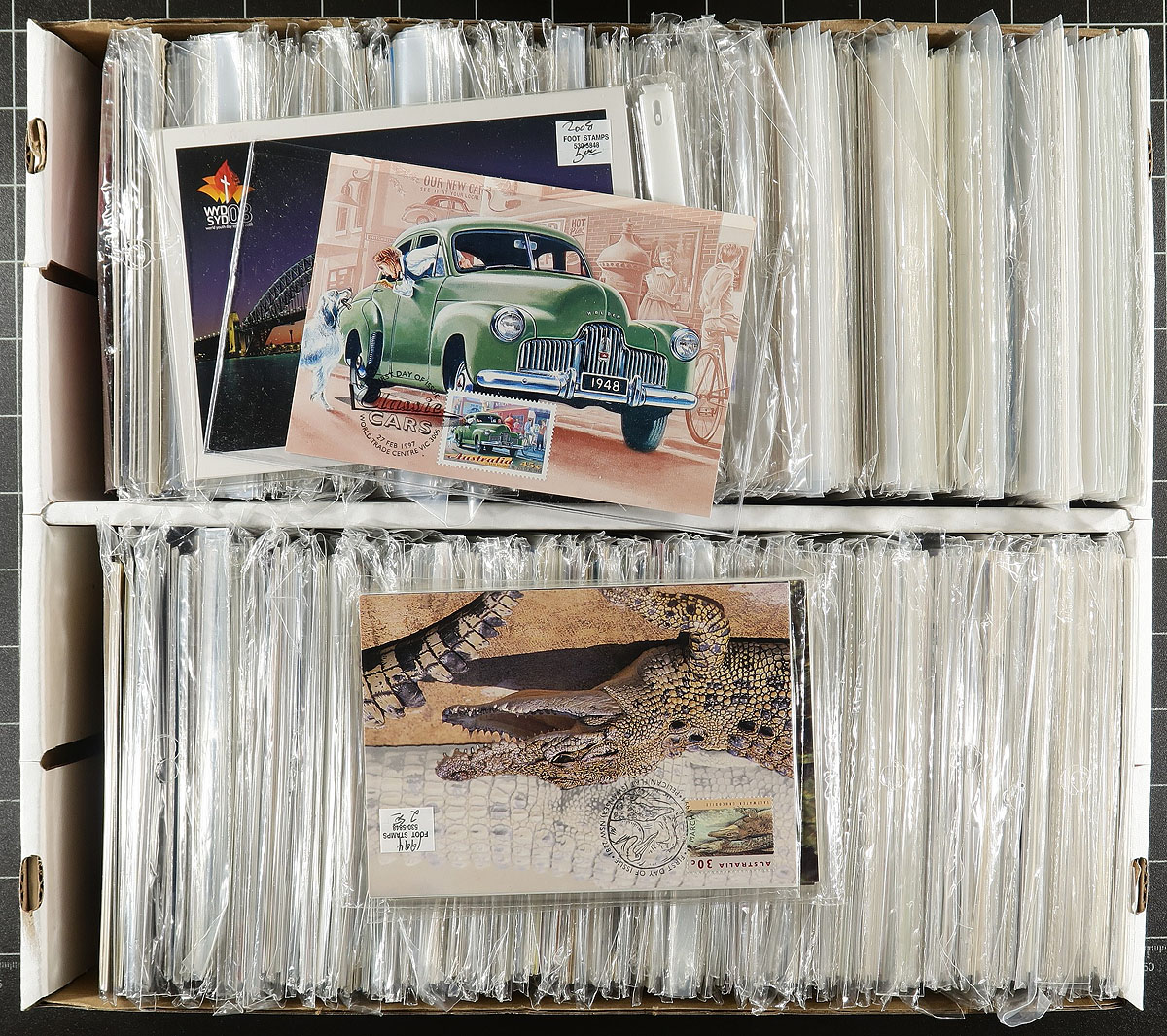 Australia - Collection of roughly 1,300 Australia maximum cards, 1990-2012, all with matching stamps tied by first day cancels. Most are still in the original cello-packs, and huge retail price at roughly $2,000. A nice clean lot, ideal for topical and thematic collectors. Estimate =