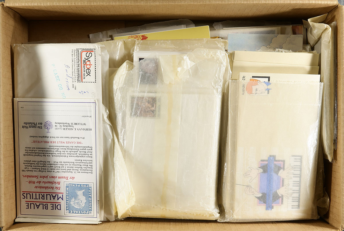 Australia - Comprehensive collection of Australia postal stationery, 1970's-1980's, containing roughly 475 pieces (mint and some with first day cancels), all purchased as new issues with the vast majority in original glassine packaging. Also includes a few sundry souvenir items. A nice lot that would be difficult to duplicate. Estimate =