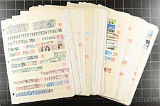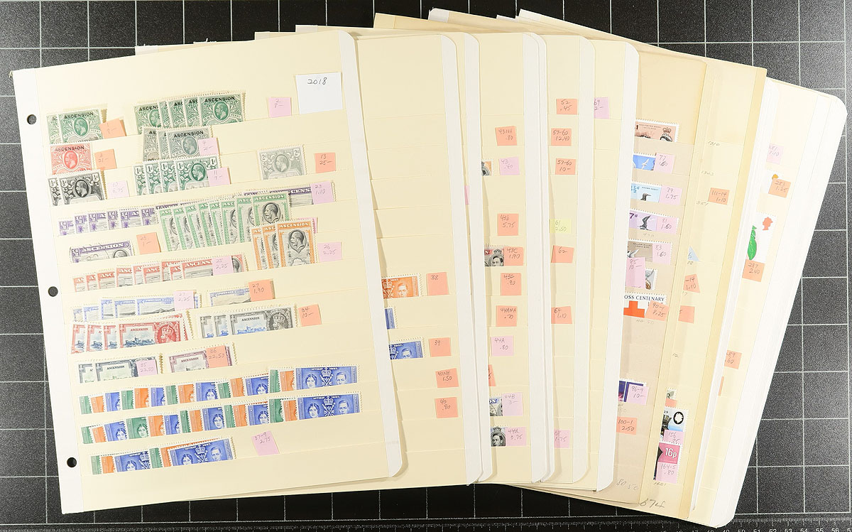 Ascension #1/829. One collector’s mint and used duplicates on 14 manila stockpages, all neatly mounted with Scott numbers and slightly older catalogue prices (won’t be far off current prices). Includes a number of items of up to $20.00 catalogue value, with some shades and perforation variants identified. There are some overprints on St. Helena issues, a selection of 1935 Silver Jubilee values, and lots of exploring in the King George VI "long" issue, with values to the 5/- and a hit or miss selection through the Queen Elizabeth era up to about 1985. There is some moderate duplication with some issues having about 15 of a type. Some nice cancels are found lurking in the used material. Substantial catalogue value here, and very few faults are to be expected. Estimate =