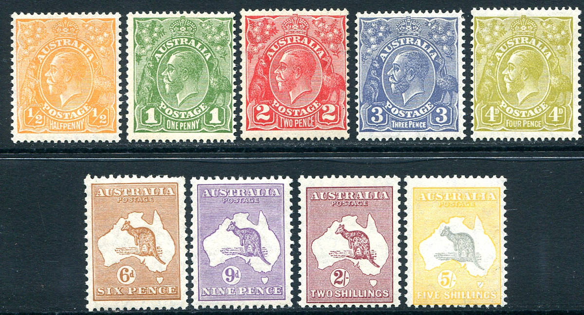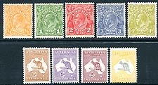 Australia #113, 114, 116-118, 121, 122, 125, 126. F/VF mint mostly Hinged mint selection of 1931-1936 period Geroge V "Heads" and "Roos". Includes a couple Never Hinged (#114 and #121) as well as the better 5sh yellow and gray (1932 issued) "Roo". 2025 Scott US$285.00 =