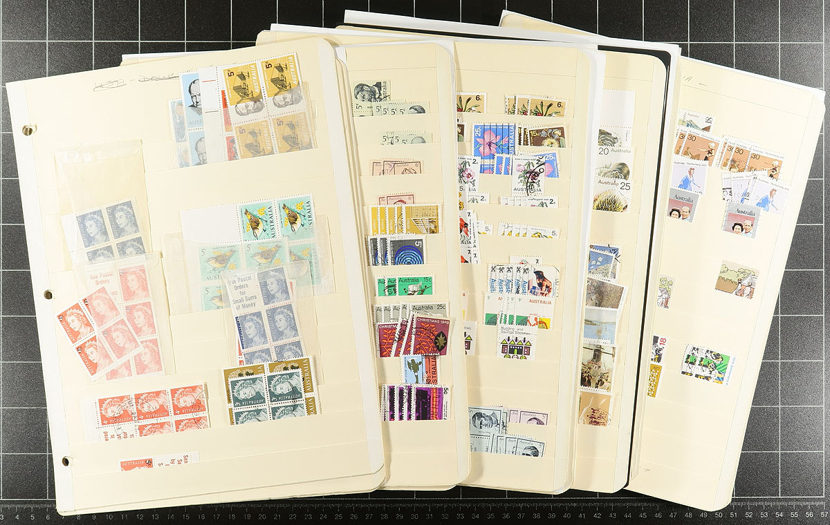 Australia #387/721. Neatly organized, high quality duplicated mint and used stock of 2,867 stamps, 11 souvenir sheets and 4 booklet panes, 1965 to 1979 decimal currency period issues. The total face value of the useable mint postage is $453.87 AUD = $408.07 CDN. A very balanced lot. Owner's older 2014 Scott US$2,038.50 =