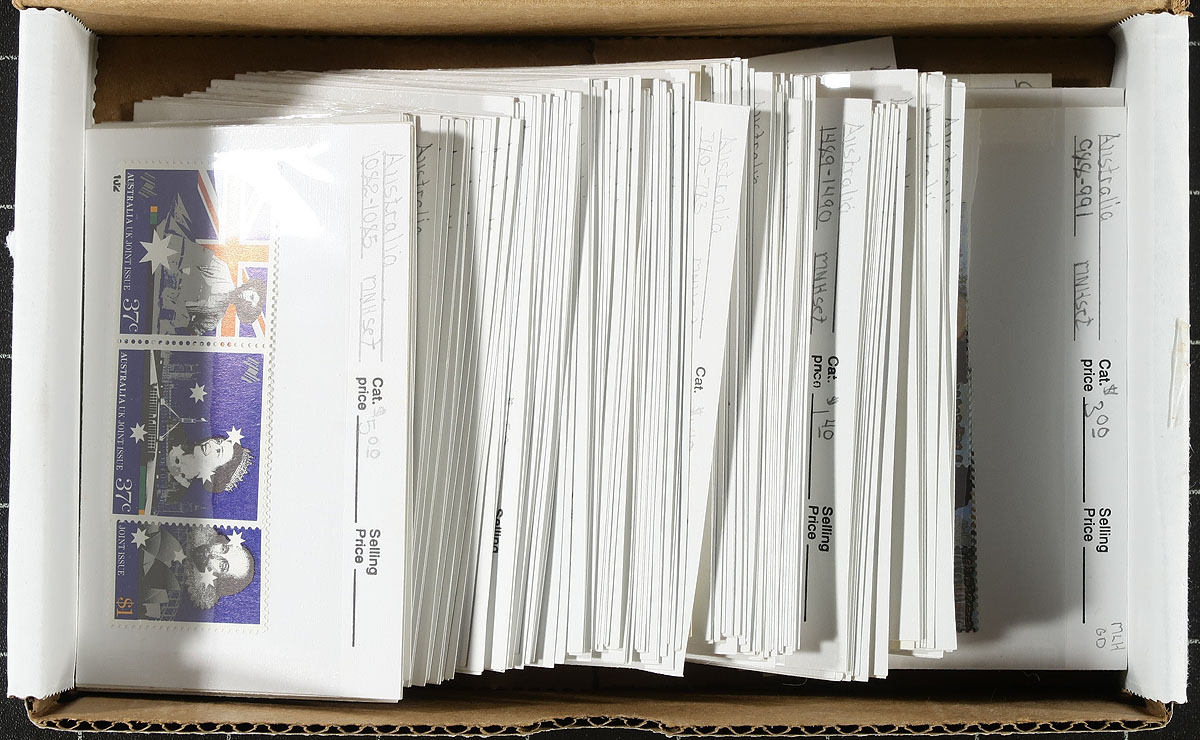 Australia #726/1490. Mint Never Hinged selection of 1980 to 1996 period issues, mostly complete sets, all sorted and priced on #102 dealer cards with a total retail of $546.00. The retail price seems to average out to around double face value. Estimate =