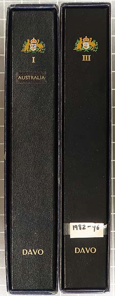 Australia Supplies - Two Australia DAVO albums with slipcases. The first album covers years 1911 to 1981, with the second from 1982 to 1996. We estimate 90% of the spaces have hingeless mounts with some of the pages having light pencil notations, and a few used stamps still in there place. Gently used and still useful for the Australia or worldwide collector, which would cost several hundreds of dollars brand new. Estimate =