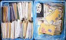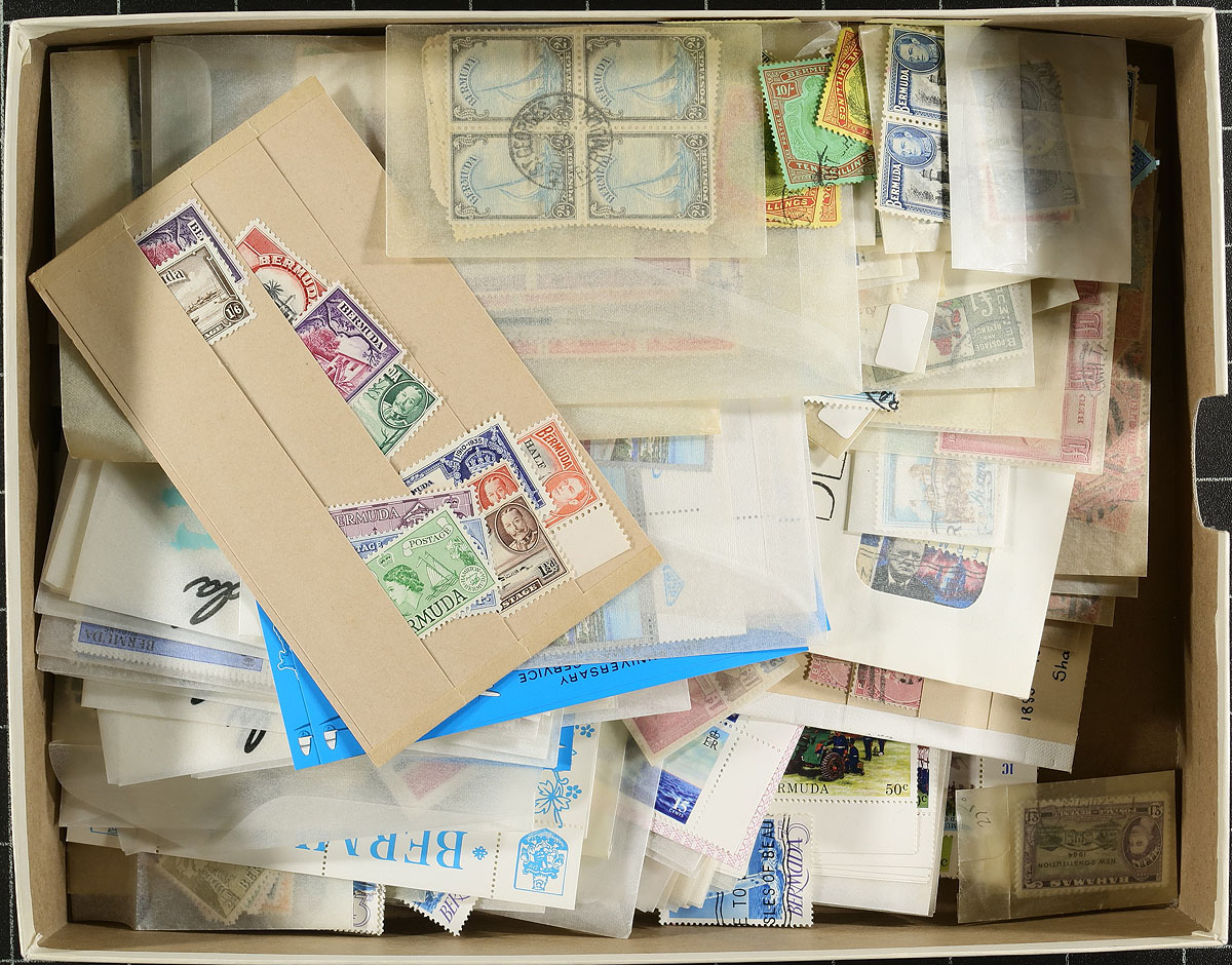 Bermuda - Envelope box with the balance of an extensive estate of Bermuda that we have been breaking up over the past year. There is a bit of mint and used Queen Victoria to King George V (the "Keyplates" are generally revenue cancelled), with some multiples, nice cancels and individual stamps. This collector bought new issues, while living in Hamilton, from the late KGVI period to about 1977, with singles, sets, some blocks of 4, and a few larger. Most of these are still in their original post office glassine envelopes and are in pristine condition. There is disorder here, and it is quite possible that there are better items hiding here or there. As received. Estimate =
