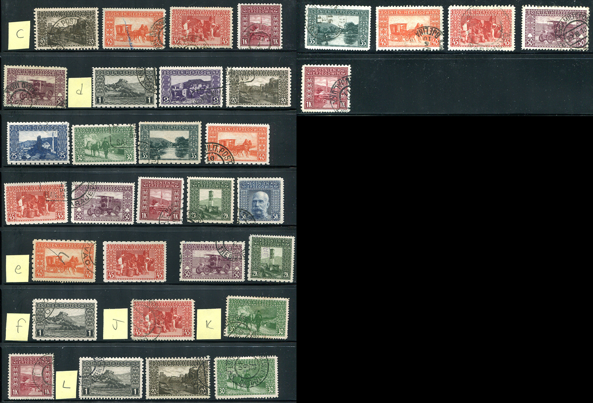 Bosnia and Herzegovina #36c/43L. A selection of 33 different used "compound perforation" issues from the 1906 "Pictorial" issue caused by individual sheets being line perforated with very different perforation gauges between various rows, causing single stamps to have 2 or 3 different perforated sides. This is a fresh-looking group, with values up to the 5kr Franz Josef. Owner’s 2021 Scott Specialized US$1496.00 =
