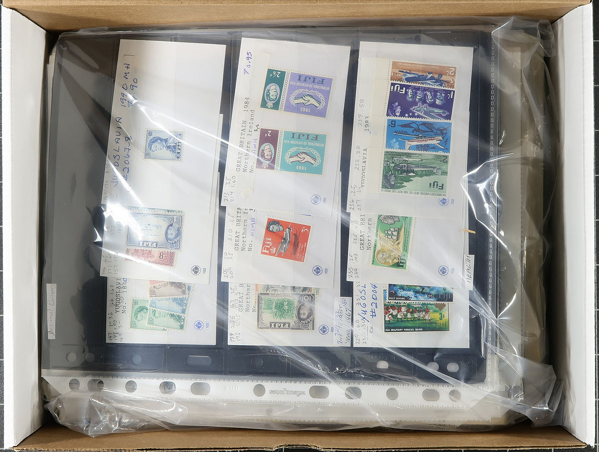 British Commonwealth - A bundle of British Asia and Pacific material, the balance of an estate that we have been breaking up. This collector bought from a number of local sources and then filed the material away, leaving the discovery and enjoyment up to a future purchaser. This lot has bidboard lots, dealer cards, loose album pages, etc. Some highlights include: India (with a bit from the back of the book and the States), Hong Kong (the older material tends to be used, the later, a mix of mint and used), with some Burma, Ceylon and Fiji. If you like putting order to chaos, this lot is for you. Substantial total catalogue value and interesting material throughout. Estimate =