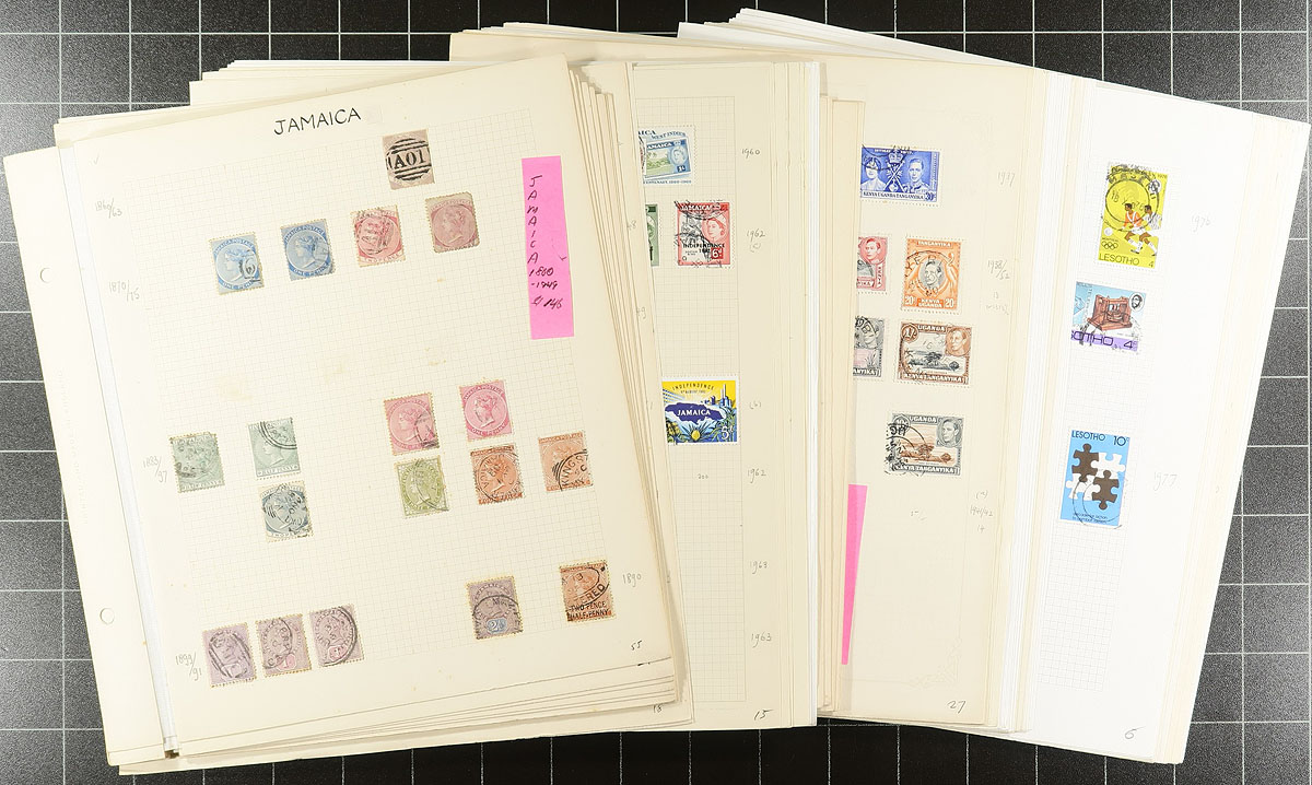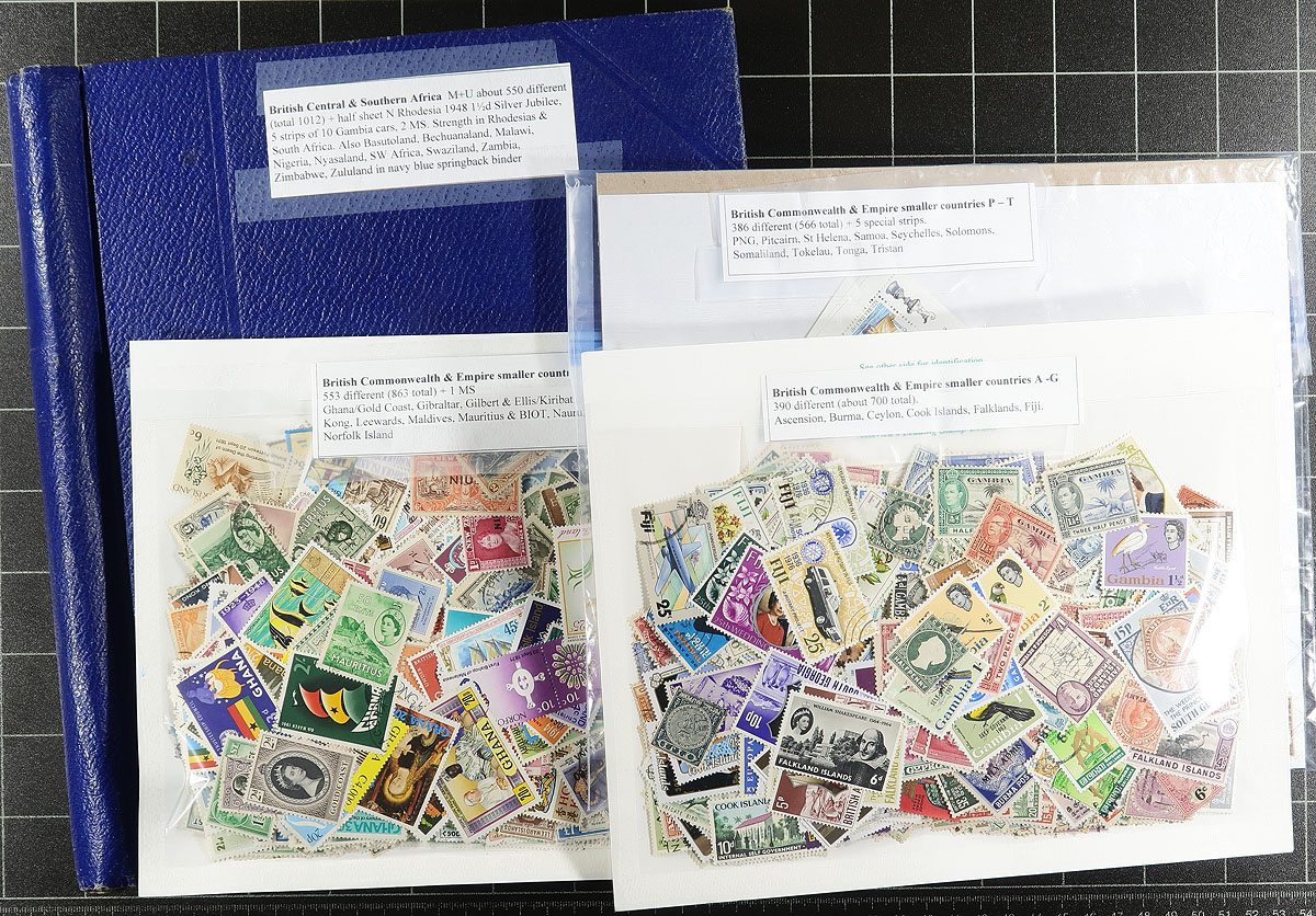 British Commonwealth - An interesting collector’s holding of British Commonwealh. Starting with a blue springback album with British Central and Southern Africa, mint and used with about 550 different (1012 stamps in total) with strength in Rhodesias, South Africa, but also notable Basutoland, Bechuanaland, Malawi, Nigeria, Nyasaland, SW Africa, Swaziland, Zambia, Zimbabwe and Zululand, plus a half-sheet of Northern Rhodesia 1948 1 ½ d Silver Jubilee, Gambia "cars" in strips. This album in nicely complemented by three packages "British Commonwealth and Empire, smaller countries" of "A to Z" mint and used, with over 2100 stamps, and consignor noting there are 1329 different stamps within these packages. The perfect group for a collector to sort out and compare against their own holdings. Estimate =