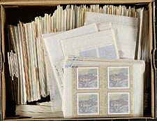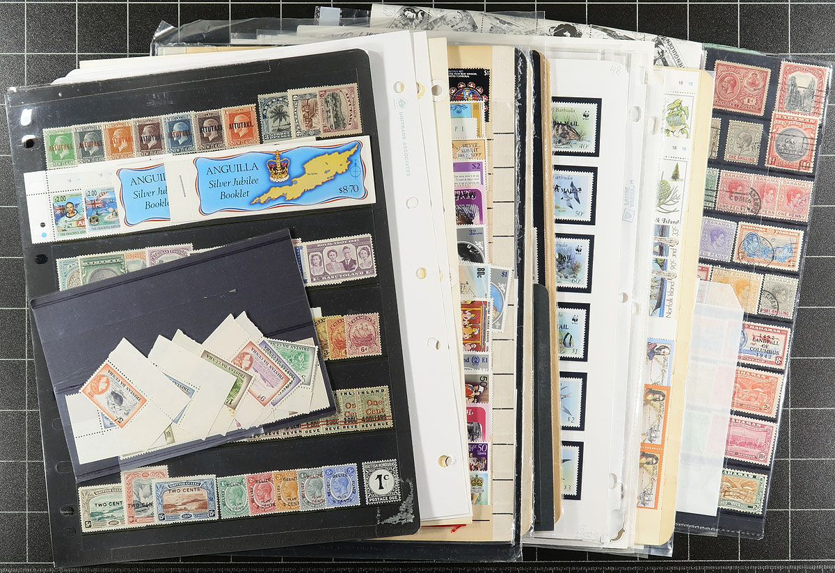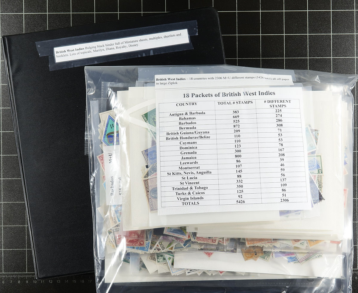 British West Indies - A worthwhile holding of British West Indies, starting with a bulging black binder fill of miniature sheets, sheets, multiples and booklets with a wild-ride of topical interest including Marilyn, Diana, Royalty and Disney. This is nicely complemented by a large bag containing 18 neatly organized packets (by country) of 5426 stamps (2306 different) from 18 different countries. Take a look at the owner listed inventory of the packets to appreciate the scope of the lot. Estimate =