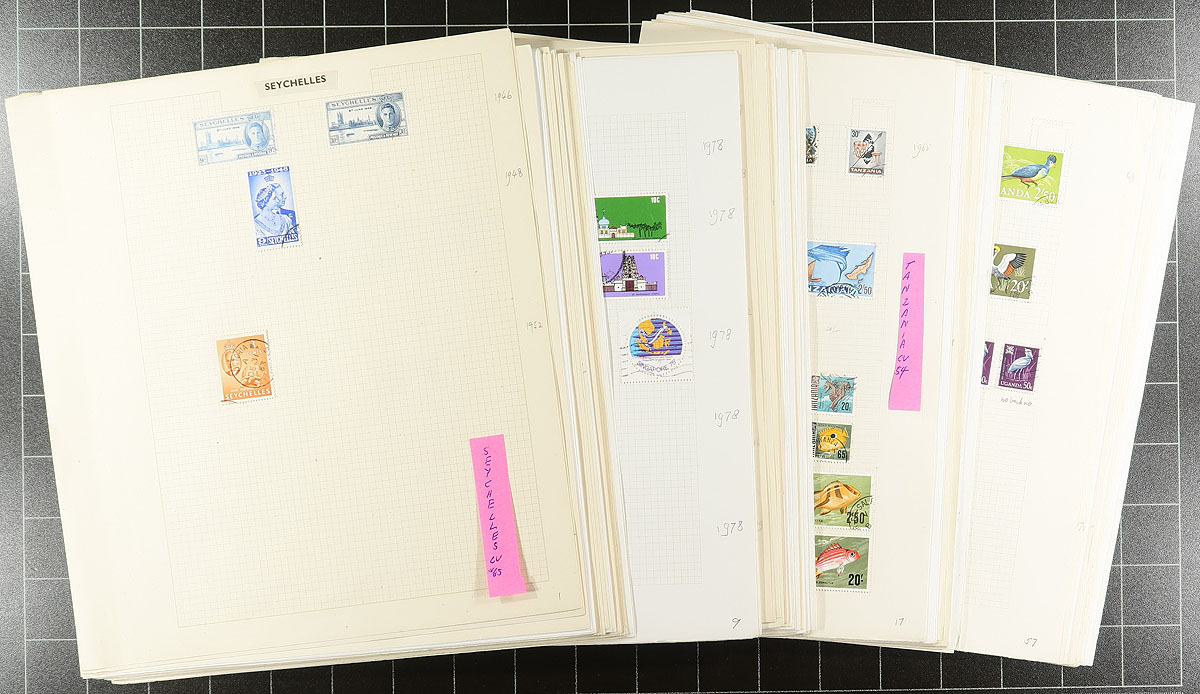 British Commonwealth - Numerous British Colonies (strong from Africa) of used issues mounted on quadrilled pages and housed in a near new red Stanley Gibbons "Tower" springback album (retails $50.00). Colonies represented include Seychelles, Sierra Leone, Singapore (about $300.00 catalogue value), Somaliland, South Rhodesia, Sri Lanka, Swaziland, Tanzania, Tonga, Trinidad and Tobago (nice Silver Wedding high value), Uganda, Zambia and another half dozen colonies with a trace of material. Most issues are from King George VI up to 1978, with the overall condition appearing excellent with little to no duplication. Total 2025 Scott US$1092.00 =