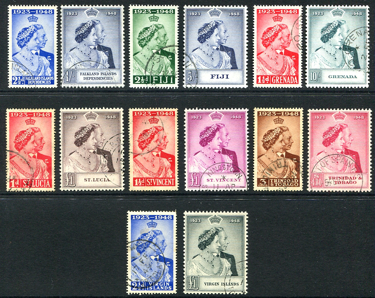 British Commonwealth - Small but sought-after assembly of 7 different used sets from the 1948 Silver Wedding Omnibus (common design) series. Includes sets from Falkland Islands Dependencies, Fiji, Grenada, Saint Lucia, Saint Vincent, Trinidad & Tobago and Virgin Islands. Arguably much harder to find than the mint counterparts. 2025 Scott US$182.25 =