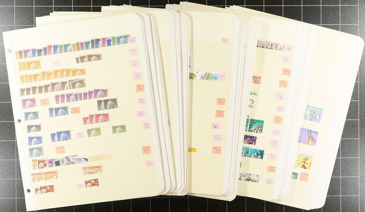 British Commonwealth - Two Australia-aligned British colonies in this 28-stockpage accumulation. Starts with Christmas Island #1/563 on 18 pages, more used in the earlier issues than normally seen and the post-1990 issues are strongly used (after this Indian Ocean colony’s mail service merged into Australia Post, the issues became usable in either area). Cocos (Keeling) Island #1/343 is on 10 pages with an even mix of mint and used. You never see much used modern material from these island outposts. Issues are post-war up to the early 21st century. Estimate =
