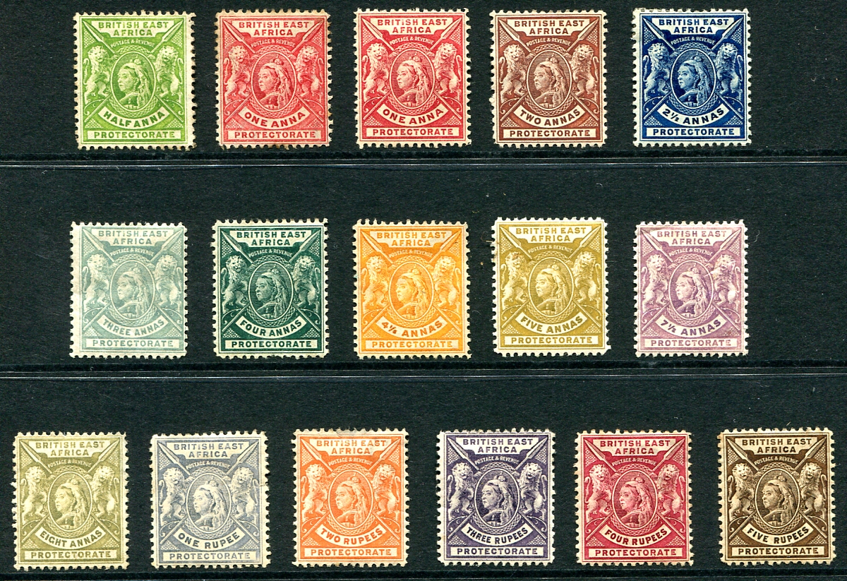 British East Africa #72-87. Complete mint / unused set of the 1896-1903 issue "Victoria and Lions" series of sixteen stamps, all with either no-gum, or hinge remnant. Generally sound and fresh, an elusive colonial set. 2025 Scott US$597.25 = 806.30
