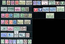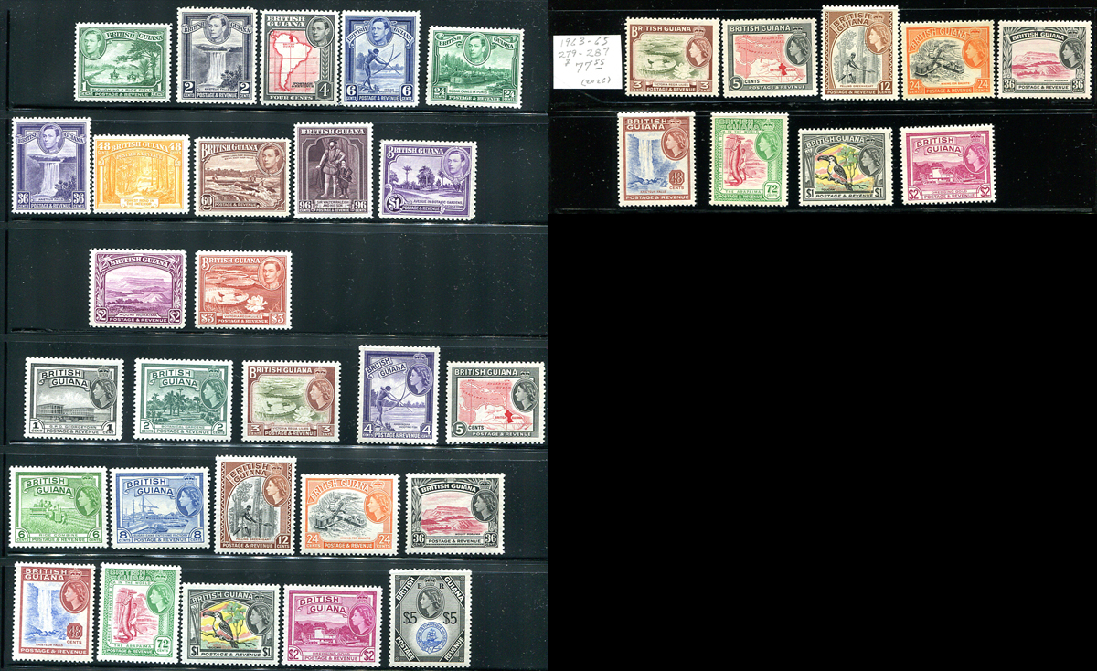 British Guiana #230-241, 253-267. Duo of complete mint sets, including the 1938-1952 George VI Pictorial series (Lightly Hinged) and 1954 QEII Pictorial series (Never Hinged). A very colourful duo of sets. 2026 Scott US$235.10 =