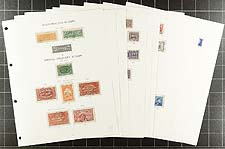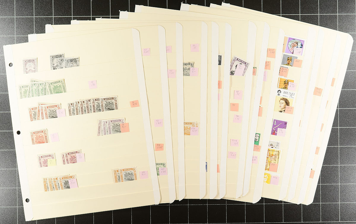 Brunei #14/508a, N3/N10. Lucky thirteen manila stockpages with a collector’s stock of mint and used Brunei from the 1907 Brunei River series up to the early 2000's. Neatly arranged and identified by Scott numbers with current catalogue values and up to 8 of a type. Better items up to $15.00 catalogue value were seen (such as #59-60). Some perforation variants are noted, along with common design issues and then far-less-common and mostly used issues from the 1980’s onward. There are even four overprints from Japanese occupation during WWII to round things out. Unusual and with lots of value. Estimate =