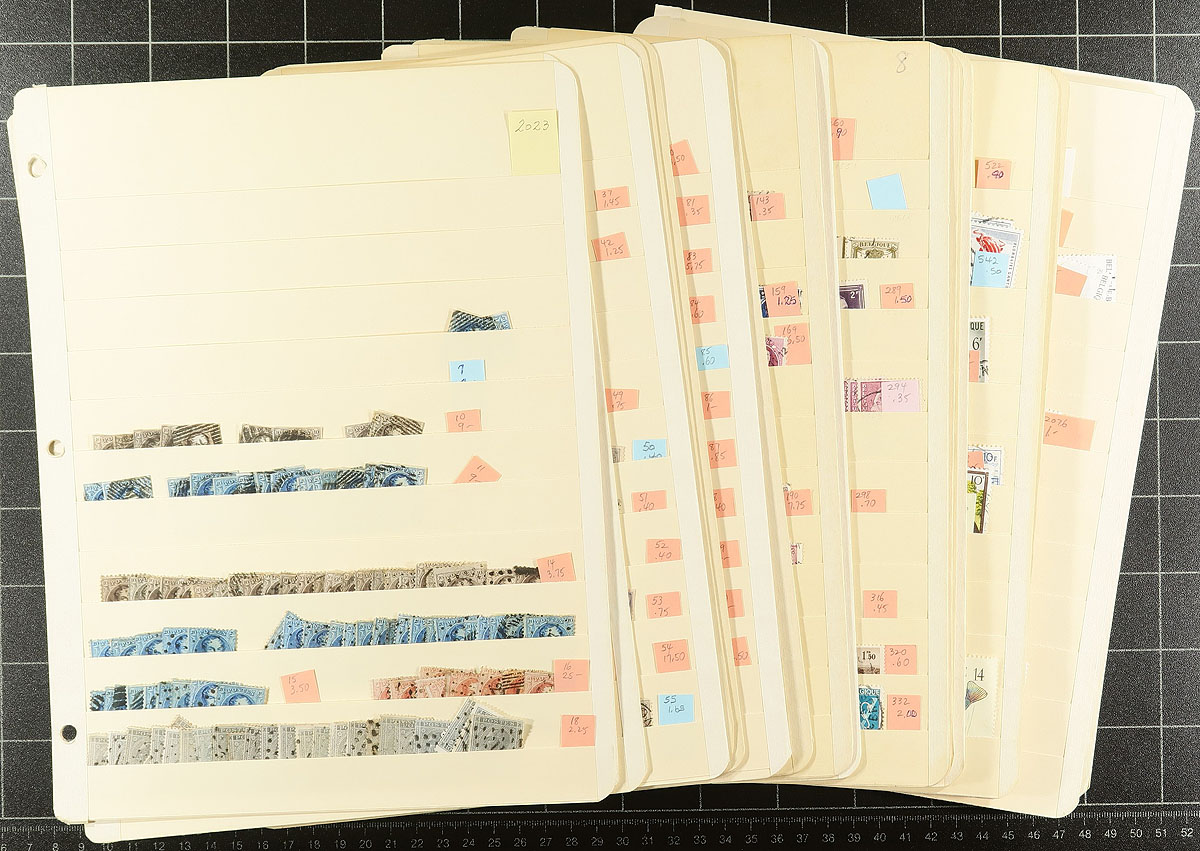 Canada #37/3287 plus Back of the Book. Extensive holding of used Canada from the small queens into the 21st century, neatly organized into 11x 32-page and 2x-16 page stock books, a mix of Lighthouse and Uni-Safe brand (plus one additional, and uncounted stockbook). The coverage is light to the end of the King George V period, but from King George VI onwards, there is often a dozen of a type (no multiples or souvenir sheets). Thousands and thousands of stamps here, all neatly organized. The stockbooks have some labels and pen notations, but are otherwise functional. Quite comfortably fills a banker’s box. Estimate =