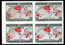 Canada #85a. Sheet margin imperforate block of the 1898 issue 2c Xmas Map stamp with grey oceans. A showpiece example of this "Map Stamp" imperforate. 2024 Unitrade is $1400.00. 2025 Scott US$900.00 =