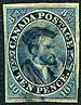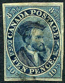 Canada #7. Fine used example of the 1855 issue 10p blue imperforate Cartier on thin pelure paper. Margins full to large on almost all sides, just touching the frameline on the lower-right corner. Attractive light postmark, leaving the image of stamp almost fully visable. 2025 Scott US$1,500.00 =