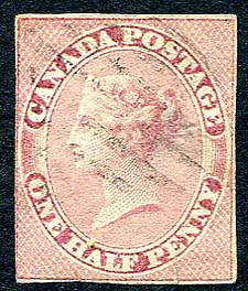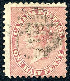 Canada #11. Fine appearing used example of the 1858 issue half-penny rose perforated pence issue, with light grid postmark. A pressed out crease, but still presents well and is missing from most collections we see. 2025 Scott US$1,500.00 =