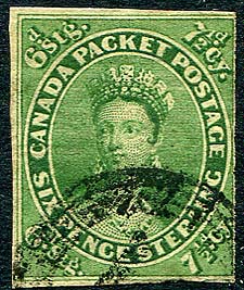 Canada #9. Attractive looking fine used example of the 7½p green Queen Victoria 1857 imperf pence issue, but with two clear margins on top/left, and just in at bottom/right. Even with tight/in margins, this is a far superior stamp to most we see in collections. Tidy partial 4-ring numeral postmark. 2025 Scott US$3,000.00 =