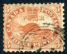 Canada #1. F/VF used example of the 1851 issue 3 Penny Beaver imperf on horizontally laid paper (good strong laid-lines visible), with decent margins on three sides, then just into the design on left. That being said, a very respectable example of Canada's "number one". 2025 Scott US$1,200.00 =