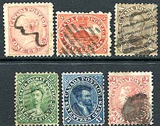 Canada #14/20. Attractive used offering of 5x 1859 "First Cents" issues, plus the 1864 QV issue 2c rose, neatly arranged on a stockcard. Some pretty stamps here, with all stamps being sound, with only the odd small perf fault. A group generally in better condition than usually seen. The 1c in particular is a huge JUMBO example. Catalogued as the cheapest listing of each stamp. 2025 Scott US$1,027.50 =