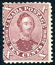 Canada #17. Mint full original gum, hinged (partial hinge remnant) example of the 1859 issue 10c "Consort" in pale red lilac. A sound and Fine "First Cents" decimal classic. 2025 Scott US$2,000.00 =
