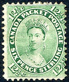 Canada #18. Mint re-gummed example of the 1859 "First Cents" issue 12 ½ c yellow green Victoria. A sound and very presentable Canadian Classic. 2024 Scott US$2000.00 =