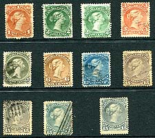 Canada #22/30. An old-time collector’s assembly of 11 (mostly) used Large Queens, as removed from and old album, unchecked for better and valued only as the basic shades / papers. All used with the exception of an example of #30 (last in the scan). Expect a couple minor faults, but overall clean and sound. 2025 Scott US$1,185.00 =