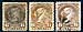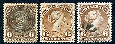 Canada #27, 27a, 27c. Useful used trio of 6c Large Queens consisting of the dark brown (#27) and yellow brown (#27a) shades as well as the thin paper variety (27c), all sound and Fine/Very Fine used. 2025 Scott US$425.00 =
