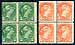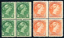 Canada #36, 41. VG/Fine mint Never Hinged blocks of four of both the 2c green and 3c right vermilion QV Small Queens. An attractive duo with full Never Hinged gum. 2025 Scott US$1800.00 =