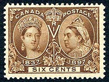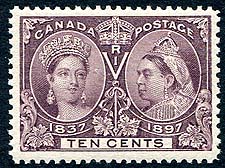 Canada #57. F/VF (very close to VF) mint Never Hinged example of the 10c brown violet 1897 Queen Victoria Jubilee issue. A very attractive example of this tough issue. 2025 Scott US$400.00 =