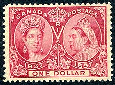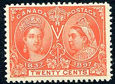 Canada #59. Vibrantly fresh and F/VF mint Lightly-Hinged, well centered example of the 20c vermilion 1897 Queen Victoria Jubilee issue. 2025 Scott US$300.00 =