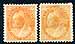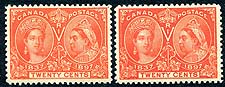 Canada #59, 59i. VF mint Lightly Hinged examples of both the "vermilion" and "deep vermilion" shades of the 1897 QV Jubilee 20c value. Nice to see these side-by-side to appreciate the difference in shades. Not acknowledged in Scott catalogue. 2024 Unitrade =