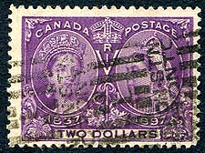 Canada #62. F/VF centered used example of the $2.00 dark purple 1897 Queen Victoria Jubilee issue. Tidy "UNION ST’N TORONTO" roller cancel. Vibrant colour on this often faded stamp! 2025 Scott US$550.00 =