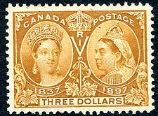 Canada #63. VF centered unused (no gum) example of the $3.00 yellow bister 1897 QV Diamond Jubilee issue. Very minor perf thin lower right, mentioned for the record. A nice stamp with strong colour, a high-value Canadian Classic. 2025 Scott US$1300.00 =