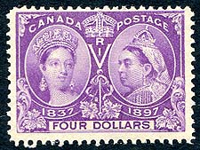 Canada #64. Fine centered unused (no gum) example of the $4.00 purple 1897 QV Diamond Jubilee issue. A nice stamp with strong colour and a sound high-value Canadian Classic. 2025 Scott US$1300.00 =