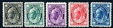 Canada #75, 79, 80 ,81, 82. /VF mint Hinged selection of five different 1897 to 1902 period Queen Victoria "Numeral" issues. Take a good look at the scan as there are some very attractive "plus value" stamps here. The 5c value has a small thin, mentioned "for the record". 2025 Scott US$990.00 =