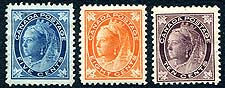 Canada #70, 72, 73. F/VF mint Hinged / Hinge Remnant trio of the 1897-1898 QV "Leaf" issue mid/high-values. A high-powered group, which presents well if you are not too worried about hinging. 2025 Scott US$1,100.00 =