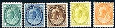 Canada #66-70. Five different fresh and F/VF mint values from the 1897-1898 Queen Victoria "Leaf" series. All hinged, some with hinge remnant, but overall quite fresh with many being better centered than usually seen. 2025 Scott US$395.00 =