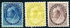 Canada #79, 81, 83. F/VF mint Hinged / Hinge Remnant trio of 1898-1902 issued QV Numeral issues mid/high-values including the 5c blue, 7c yellow ochre and 10c brown violet. A high-powered trio. 2025 Scott US$840.00 =