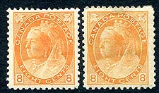 Canada #82, 82i. F/VF mint Hinged / Hinge Remnant examples of the 1898-1899 issued 8c QV Numeral issue in both the Unitrade listed Orange and Brownish Orange shades. A very subtle difference, so nice to get these side-by-side. Not acknowledged in Scott, so valued as two regular stamps. 2025 Scott US$700.00 =