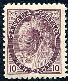 Canada #83. VF mint Hinged / Hinged Remnant of the 10c brown violet 1898 issued QV Numeral issue. A very pretty stamp by the face, without having to pay the huge premium for Never Hinged. 2024 Scott Classic US$450.00 =