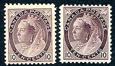 Canada #83, 83i. F/VF mint Hinged examples of both the Unitrade listed brown violet / deep brown violet shades of the 10c QV "Numeral". Not listed in Scott, so valued as two basic stamps. Nice to get these side-by-side to be able to see the subtle shade difference. 2025 Scott US$900.00 =