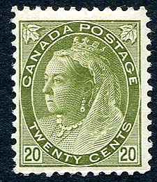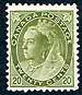 Canada #84. F/VF mint Hinged / Hinge Remnant example of the 1900 issue 20c olive green Queen Victoria Numeral high value. Nice eye appeal and great colour. 2024 Scott Classic US$650.00 =