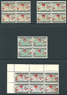 Canada #85, 86, 86b. Mint Map Multiples. An eye-catching assembly of 1898 Map Stamp blocks, with blocks of four of #85, 86, 86b (all hinged / gum disturbed on top pairs, Never Hinged bottom pairs), followed by a mint Never Hinged corner block of six, with inscription "American Bank Note Co. Ottawa" in selvedge above right stamp. Catalogued as basic stamps, but certainly worth more as multiples. 2025 Scott US$1510.00 =